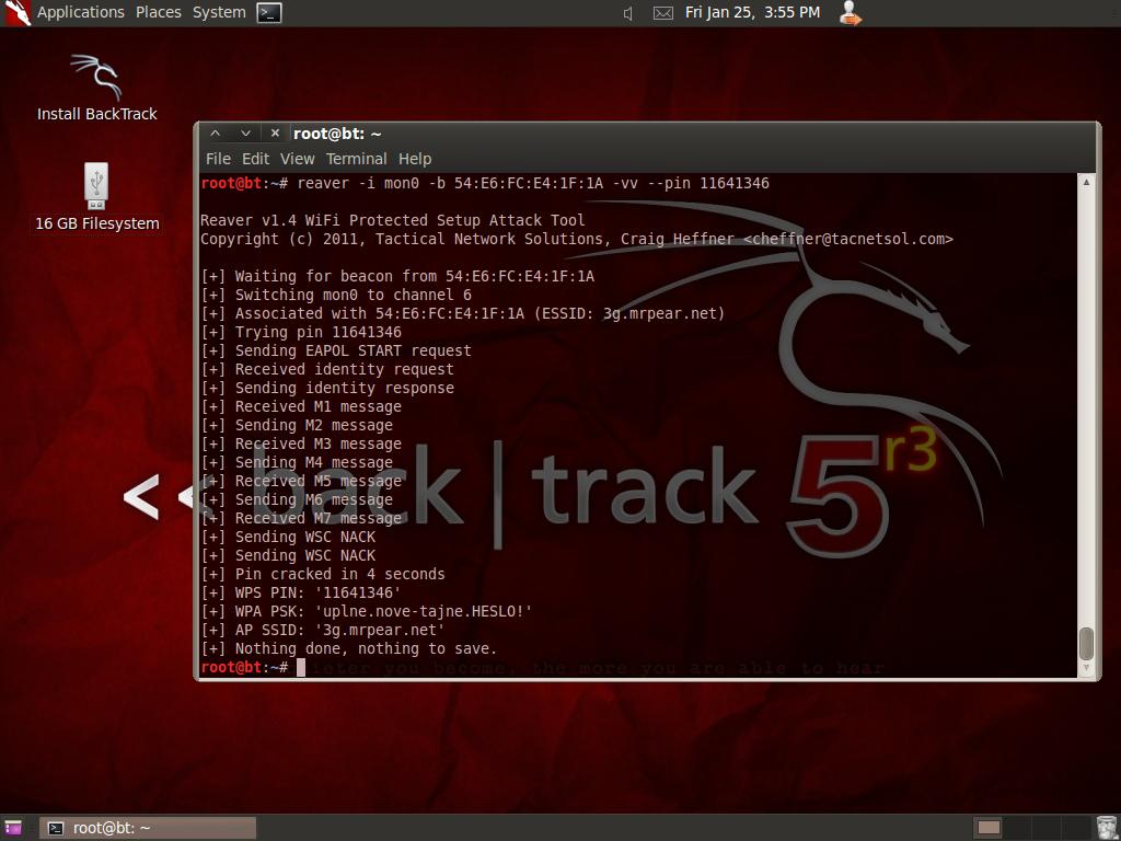 Pokud bude náš útok úspěšný, získáme přes slabinu WPS heslo k wifi síti, tedy část PSK z WPA(2)-PSK. Útok a jeho časová náročnost nemá vůbec žádnou souvislost s kvalitou použitého klíče (hesla), protože znovu opakuji, útočíme na WPS, nikoliv na WPA. Nadále platí, že WPA jako takové nelze prolomit jinak než hrubou silou a je tak teoreticky samo o sobě neprolomitelné v případě, že je heslo dostatečně silné.Představení BackTrack Linux